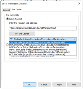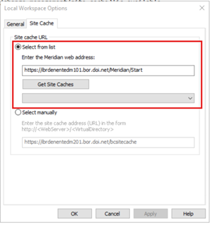 - In the Site cache URL section, under the “Select from list” section, enter either of the two Meridian Web Addresses below and click the “Get Site Caches” button.